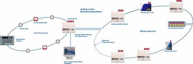 Stratos-HSSD 2 Melder können als Teil eines vernetzen Systems mit einem Steuermodul als übergeordnete Einheit eingesetzt werden. Bei dem Melder-Datenbus handelt es sich um eine RS 485-Verbindung, dessen Leitungslänge zwischen zwei benachbarten Stratos-HSSD Meldern 1.200 m nicht überschreiten darf. Die Betriebszustände aller vernetzten Melder werden am Steuermodul angezeigt. Eine Parallelanzeige der Betriebszustände eines Melders kann auch über je eine Fernanzeigeeinheit erfolgen. Die Bedienung der vernetzten Melder ist zentral über das Steuermodul oder am Melder selber möglich, soweit der Melder mit Bedienelementen ausgerüstet ist. Zur Visualisierung der Melderzustände und –bereiche auf einem Computer steht die Kommunikationssoftware SenseNET zur Verfügung. Ist eine Überwachung mehrerer Melder von zentraler Stelle nicht erforderlich, können die Stratos-HSSD 2 Melder auch als autarke Geräte in einem abgegrenzten Bereich eingesetzt werden. Die Komponenten der Stratos-HSSD 2 – Serie (Standardmelder, Steuermodul, Micra) besitzen eine Reihe von Möglichkeiten zur Weitermeldung, beginnend bei der herkömmlichen Verwendung der eingebauten Alarm- und Störungsrelais bis hin zum Einsatz von adressierbaren Meldebausteinen. Für Brandmeldezentralen mit Meldereinzelkennung existieren Busschnittstellenkarten (Addressable Panel Interface Cards - APICs) zum Einbau in die Komponenten, die den Verkabelungsaufwand in Ringbussystemen erheblich verringern. |